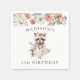 Des serviettes de fête d'anniversaire agrémentées d'une bordure fleurie en haut de la conception avec une aquarelle illustrant un bébé raton laveur entouré de fleurs blanches d'hiver, de baies sèches rouges et de feuilles verts luxuriants. Personnalisez les serviettes d'anniversaire du raton laveur avec le nom et l'âge de l'enfant. Conçu pour coordonner avec notre collection d'Aquarelles Bébés Animaux d'hiver Anniversaire d'hiver.