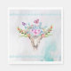 Serviettes en papier avec un arrière - plan d'aquarelle turquoise et pastel. Un crâne animal chic boho avec un bouquet floral sur la tête et des petits papillons qui fleurissent. Une jolie bordure décorative aux petites teardrop en bleu clair.