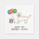 Design à thème d'anniversaire mignon avec l'illustration originale de Destei d'un mignon manteau anglais couleur crème Golden Retriever race dog. Le chien a une expression de visage heureux avec des yeux gentils et la langue rose du chien montre. A côté du chien il y a des ballons colorés d'anniversaire attachés sur un os de chien et une boîte cadeau de couleur violet et jaune. L'arrière - plan a un motif ludique de confettis pastel colorés sur un arrière - plan blanc. Vous trouverez également une zone de texte personnalisable.