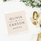Les serviettes modernes et chic neutres chaudes blanches et noires en mariage présentent un design élégant et minimaliste en monogramme typographique noir qui peut être personnalisé avec les noms des mariés et des mariés et la date du mariage.