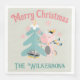 Cette serviette de table de fête de Noël est une illustration de dessin animé de style boho mignon. Une jolie licorne rose orne son sapin de Noël sous des flocons de neige qui tombent. L'arrière - plan est une couleur verte sage douce.