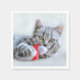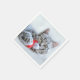 Des serviettes en papier avec une jolie photo de Noël d'un chat tabby gris mordant joyeusement un chapeau santa rouge. Ses gros pattes moelleuses rendent cette photo très agréable.