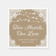 Serviettes en papier mariage rustique romantique avec "Deux coeurs, un amour" texte sur un papier kraft et arrière - plan en dentelle fleurie blanche.