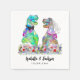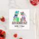 Un mariage à thème dinosaure amusant avec mariée dinosaure et marié dans un beau pré fleur sauvage coloré une serviette de mariage dinosaure personnalisée pour ravir vos invités. Facile à customiser avec les noms des mariés et des mariés et la date du mariage dans le script de typographie moderne. Drôle Tyrannosaurus Rex marié et marié et aquarelle d'été illustrations florales dans les tons violet bleu rose vert jaune et orange. Dino original unique et oeuvres d'art florales d'été de l'artiste Catherine Sweetman