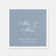 Serviettes mariages pour mariage de couleur mariage bleu poussiéreux. Texte blanc sur arrière - plan bleu poussiéreux. Les mots "M. & Mme" sont écrits dans un élégant script calligraphique, les noms de la mariée et du marié et la date en casquette plus petits.