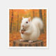 Un écureuil blanc aux yeux brillants tient un glacier assis sur une souche d'arbre, sur un fond de feuillage automnal vibrant