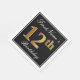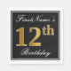 Cette conception simple et élégante de serviette en papier comporte un message comme "12e anniversaire du prénom" (avec le "12e" ayant une fausse couleur dorée) dans une zone carré de couleur noire avec un contour de bordure simple. Le nom est dans un texte de type script de couleur blanche, et peut être personnalisé. Des serviettes comme celles-ci pourraient être utilisées à une fête d'anniversaire pour quelqu'un qui célèbre son douzième anniversaire. [~Z0000136]
