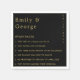 Ajoutez une touche personnelle à votre réception de mariage avec ces serviettes mariages élégantes et modernes. L'arrière - plan noir classe constitue le cadre parfait pour l'élégante typographie or et les faits amusants sur la mariée et le marié. Vos invités aimeront apprendre sur vos choses préférées, comment vous vous êtes rencontrés et d'autres informations intéressantes sur votre relation. Le design est simple et personnalisable, vous permettant de choisir la couleur parfaite pour correspondre à votre thème mariage. Ces serviettes ne sont pas seulement pratiques, mais elles ajoutent une touche unique et charmante à votre réception. Rendez votre journée spéciale encore plus mémorable avec ces serviettes mariages amusantes et personnalisables.
