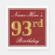 Cette conception simple et élégante de serviette en papier comporte un message comme "Name-Here’s 93rd Birthday" (avec le "93rd" ayant une fausse couleur dorée) dans une zone carré de couleur rouge avec un contour de bordure simple. Le nom est dans un texte de type script de couleur blanche, et peut être personnalisé. Des serviettes comme celles-ci pourraient peut-être être utilisées à une fête d'anniversaire pour quelqu'un qui célèbre son quatre-vingt-treize anniversaire. [~Z0000138]