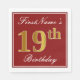Cette conception simple et élégante de serviette en papier comporte un message comme "19e anniversaire du prénom" (le "19e" ayant une fausse couleur dorée) dans une zone carré de couleur rouge avec un contour de bordure simple. Le nom est dans un texte de type script de couleur blanche, et peut être personnalisé. Des serviettes comme celles-ci pourraient être utilisées à une fête d'anniversaire pour quelqu'un qui célèbre son dix-neuvième anniversaire. [~Z0000138]
