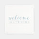 Le coussin lombaire moderne bleu et blanc "Welcome" présente un texte élégant avec le nom de famille.