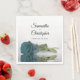 Ces magnifiques serviettes mariages ajouteront style et classe à votre réception, dîner de répétition ou autre événement mariage. Elles présentent un design simple mais élégant et romantique avec une seule rose turquoise à long tige ou turquoise réfléchissant dans un bassin d'eau avec vagues et ondulations. Au-dessus du rose se trouvent les noms du couple et la date du mariage.