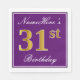 Cette conception simple et élégante de serviette en papier comporte un message comme "NameHere’s 31st Birthday" (avec le "31st" ayant un faux look doré) dans une zone carré de couleur violette avec une bordure simple. Le nom est dans un texte de type script de couleur blanche, et peut être customisé. Des serviettes comme celles-ci pourraient peut-être être utilisées à une fête d'anniversaire pour quelqu'un qui célèbre son trente et unième anniversaire. [~Z0000140]
