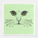 Cette serviette en papier a une gravure noire du visage d'un chat chaton avec des yeux verts vibrants et de longs murmures sur un arrière - plan vert clair.