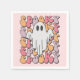 Ce design d'Halloween amusant et festif présente une illustration fantôme classique avant et centre, entourée du mot "Éffrayant" répété dans une police audacieuse et mousseuse. Le texte est superposé à des couleurs vibrantes et d'inspiration rétro, comme des roses douces, des violets et des oranges, créant un contraste ludique avec la simple silhouette blanche du fantôme. Les yeux noirs sans expressivité du fantôme apportent une touche de charme étrange, tandis que la typographie ondulée et empilée donne au design une atmosphère super et nostalgique.