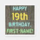 Ce design amusant de serviette de fête d'anniversaire comporte un message comme "HAPPY 19th BIRTHDAY, FIRST-NAME!", où le nom peut être personnalisé. L'arrière - plan présente un motif rustique, brun, imitation bois de grain. Le texte du message personnalisé présente des couleurs comme le bleu, le jaune et le vert, et il a un aspect inspiré de celui du lettrage peint et recouvert de pochoirs. Des serviettes comme celles-ci pourraient être utilisées à une fête d'anniversaire pour quelqu'un qui célèbre son dix-neuvième anniversaire. [~Z0000292]