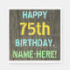 This fun birthday party napkin design fea message like "HAPPY 75th BIRTHDAY, NAME-HERE!", where the name can be personalized. The background feobjets a rustic, brown, faux grain appearance pattern. The customizable message text objets colors like like blue, yellow, and green, et it has an appearance inspecred by that of painted, stenciled lettering. Napkins like these could perhaps be used at a birthday party for somebody who is celebrating their seventy fifth birthday. 2