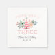 Des serviettes en papier adorables pour la fête du troisième anniversaire de votre animal sauvage arborent une illustration de tipi rose flanquée de pêches pastel et de fleurs de menthe. "Jeune, sauvage et trois" apparaît en lettres de pêche. Personnalisez avec le nom de la fille d'anniversaire et la date de la fête sous le gris chic.