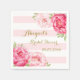serviettes de Fête des mariées en clair rose pâle et rayures blanches avec aquarelle rose fleurs vintages et texte couleur or.