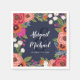 Serviettes de cocktail bleu marine pour un mariage aux compositions florales colorées en orange, corail, rose chaud, bleu et vert olive. Les noms du couple heureux en script de calligraphie blanche. Ajoutez aussi votre date de mariage !