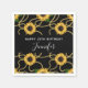 Fête d'anniversaire ou autres serviettes en papier événementiel avec un motif élégant et élégant. Joli tournesol jaune et feuilles verts entourés de fines chaînes d'or. Arrière - plan noir. Personnalisez avec votre propre texte.