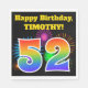 Ce design amusant et dynamique de serviette en papier présente un motif coloré inspiré par les feux d'artifice célébré, ainsi que le numéro "52" avec un motif dégradé multicolore inspiré arc-en-ciel, sur un arrière - plan de couleur noire. Il comporte également un nom et un message d'événement personnalisés. Des serviettes en papier comme celle-ci pourraient être utilisées lors d’une fête organisée pour célébrer le cinquante-deuxième anniversaire de quelqu’un. [~Z0000326]