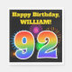 Ce design amusant et dynamique de serviette en papier présente un motif coloré inspiré par les feux d'artifice, ainsi que le numéro "92" avec un motif multicolore en dégradé d'inspiration arc-en-ciel, sur un arrière - plan de couleur noire. Il comporte également un nom et un message d'événement personnalisés. Des serviettes en papier comme celle-ci pourraient être utilisées lors d’une fête organisée pour célébrer le quatre-vingt-dix-deuxième anniversaire de quelqu’un. [~Z0000326]