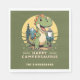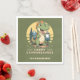 Créez des serviettes en papier personnalisées uniques pour une fête de camping. Le design comprend un mignon dinosaure buvant du café à l'extérieur (ou d'autres boissons chaudes comme le thé, le cacao, etc.) Le modèle facilite la saisie de votre nom de famille ou d'un autre texte. Ce design est sur l'arrière - plan vert olive.