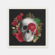 Serviettes en papier avec illustration de style goth. Belles roses rouges et feuilles d'or entourant un crâne noir et blanc.