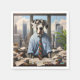 Un grand Danois anthropomorphisé assis derrière un bureau désordonné dans un haut bureau portant une chemise et une cravate.