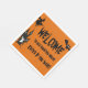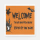 Halloween Bienvenue à notre Haunted House napkin pour Halloween! Chauves-souris noires, sorcière chevauchant un bâton de brosse et un fantôme dans une maison hantée sur arrière - plan orange ! Lettres déplaisantes en Happy Halloween !