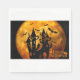Ce design présente un joyeux accueil d'Halloween avec une image de pleine lune éclairée dans une éffrayante nuance d'orange vif. Vous pouvez aussi voir une maison hantée et des chauves-souris voler en l'air. A côté du texte se trouvent deux petites images : une d'un chat et une autre d'un citrouille, toutes deux associées à Halloween.