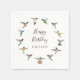This birthday napkin features several hummingbird species native to North America such as Anna's Hummingbirds, Rufous, Ruby-throated, Black-chinned, Costa's and Allen's Hummingbirds. Personalize it with your birthday party details using the templates provided. The font style, font color, and font size can be changed by clicking on "Edit design".