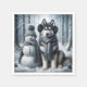 Un Husky sibérien moelleux portant une écharpe et des oreilles est assis à côté d'un bonhomme de neige gai orné d'un casquette et d'une écharpe