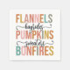 Ce design d'automne coloré et amusant présente une liste de favoris d'automne, dont "Flannels", "Hayrides", "Citrouilles", "Sweaters" et "Bonfires". Le texte est présenté dans une police majuscule et audacieuse, chaque mot étant rempli d'une teinte terreuse et chaleureuse différente, allant des roses douces aux oranges en passant par les verts et les bleus muets, qui capte parfaitement l'esprit cosy et vibrant de la saison. Les mots "hayrides" et "pull-overs" sont écrits dans un script fluide, ajoutant une touche d'élégance et créant un contraste agréable avec les caractères gras. Des fleurs décoratives encadrent le texte du script, ajoutant au charme et à l'attrait d'ensemble. Ce design est parfait pour l'automne.