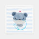 Des serviettes en papier avec une jolie illustration d'un ours bleu portant un casquette d'infirmières avec un petit coeur dessus. Portant également un masque de protection et a un stéthescope bleu aussi.
