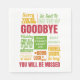 Dites au revoir avec style. Ce fabuleux design typographique comporte plusieurs messages d'adieu. Une serviette merveilleuse pour envoyer vos meilleurs voeux et décorer une table de fête. Serait parfait pour la fête de départ d'un employé ou d'un collègue de bureau. Peut être personnalisé avec un message court.