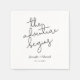 Une serviette mariage moderne avec un texte manuscrit qui dit "l'aventure commence" en noir et blanc. Ce design typographique est minimaliste et fonctionne pour n'importe quelle saison. Customisez ce produit en ajoutant les noms du couple et la date de l'événement.