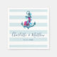 Design de serviette mariage nautique avec ancre avec fleurs sur un arrière - plan à rayures bleues.