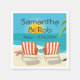 Conception MARIAGE TROPICAL avec une scène de plage avec deux chaises rayées tournées vers la mer. Un cœur a été dessiné entre eux dans le sable. Texte personnalisable. Ajoutez le nom de la mariée et du marié, la date du mariage ou ce que vous voulez ! Original de PinkInkArt !