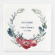 Une branche de genévriers bleu aquarelle, feuille d'eucalyptus et roses rouges bordeaux sauvages et couronne de fruits bleu marine ont donné le ton de cet élégant mariage d'hiver avec vos noms et date numérique dans un bloc rustique.
