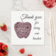 Ajoutez une touche personnelle à la fête de fin d'année avec ces serviettes. Les serviettes sont ornées d'une belle pomme de mosaïque rouge qui marie les mots "Merci d'être notre professeur". La pomme rouge a été conçue de façon à donner à la pomme une apparence de mosaïque ou de vitrail avec des carreaux de rouge, gris et noir. La fin de l'année ou la semaine d'appréciation des enseignants est le moment idéal pour dire merci à l'enseignant de votre enfant pour tout le travail acharné qu'il a accompli.