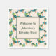 Cette serviette en papier avec une ambiance rétro peut être customisée pour toute fête ou événement. Le design se compose d'un motif aux influences du milieu du siècle, de simples graphiques en palmiers orange et vert, disposés autour d'une oasis en forme de boomerang ou d'une piscine dans un bleu d'eau vive. La couleur arrière - plan de sable peut être modifiée.