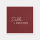 Des serviettes de mariage bordeaux modernes, au design simple et minimal, avec le nom de la mariée dans un script élégant et le nom du marié dans une police sans serif contemporaine. Ces serviettes de style minimaliste s'ajoutent à votre réception de mariage, à votre fête de fiançailles ou à votre douche nuptiale.