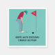 Un golfeur bleu clair, portant un casquette, une chemise rouge et un pantalon bleu, mettant une balle de golf dans une serviette design trou. Customisez le texte.