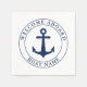 Serviettes en papier nautique simples avec ancre bleu marine et texte Bienvenue à bord dans un cercle facile à personnaliser avec votre nom de bateau.