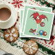 Un dragon rouge mignon dans un verre à martini tenant une olive verte. Ornements, olives vertes et un cadeau tout autour.