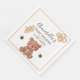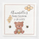 Ces serviettes de baby shower personnalisées sont décorées sur le thème des abeilles et du miel. Un mignon petit ours qui mange du miel est représenté en bas avec deux abeilles qui bourdonnent près. Un tableau d'abeilles illustre la zone de texte au centre. Un exemple de nom est imprimé au-dessus d'un événement, "Baby shower" suivi de la date de la célébration. Vous pouvez personnaliser les serviettes pour inclure vos informations personnelles ou d'autres textes personnalisés.