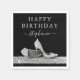 Elégante et chic moderne Silver et Black Happy Birthday Serviettes personnalisées avec Faux Parties scintillant Silver High Heel Stiletto Chaussures et nom personnalisé script de calligraphie cursive en noir et blanc.