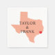 Peach map shape of the state of Texas... la couleur est personnalisable pour correspondre à votre palette de couleurs mariages. Customisez la couleur du coeur rouge et déplacez le graphique vectoriel vers votre emplacement mariage sur la forme de carte. Customisez l'élégant style de texte moderne pour créer vos propres serviettes de réception de mariage personnalisées.